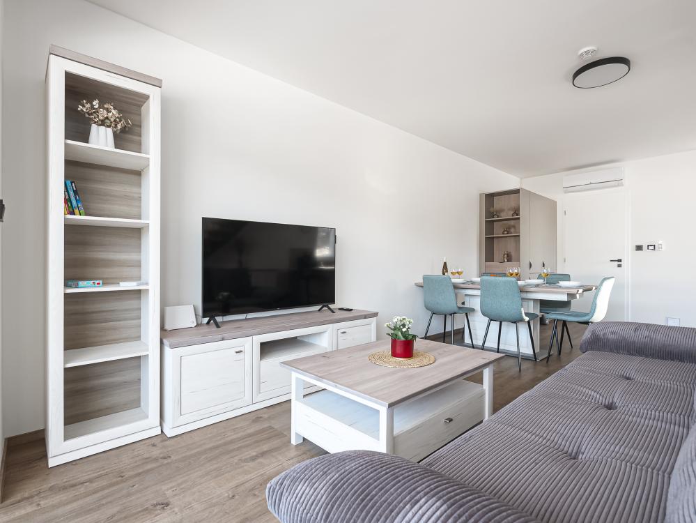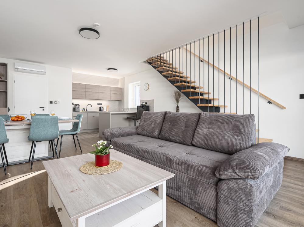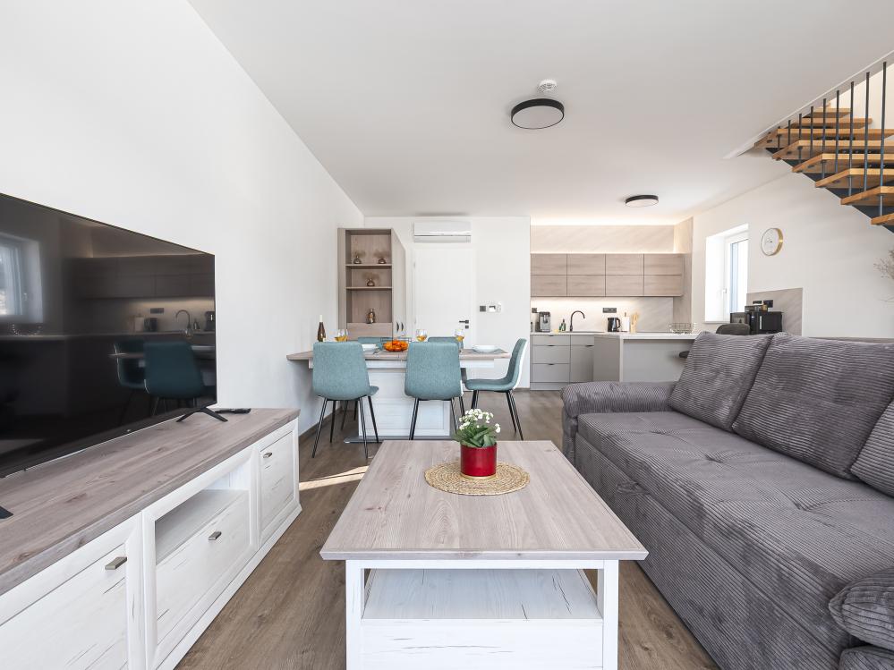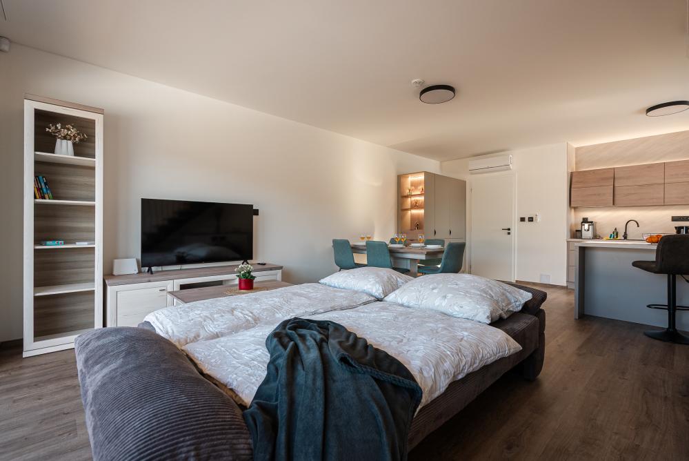 ✔ Pro vaše pohodlí je tu dvoulůžkový rozkládací gauč a TV, takže si můžete vychutnat filmovou pohodu nebo odpočinek.
