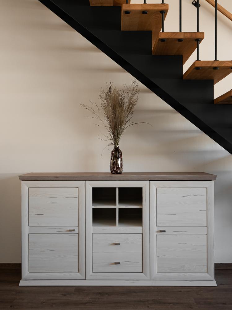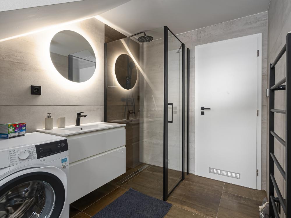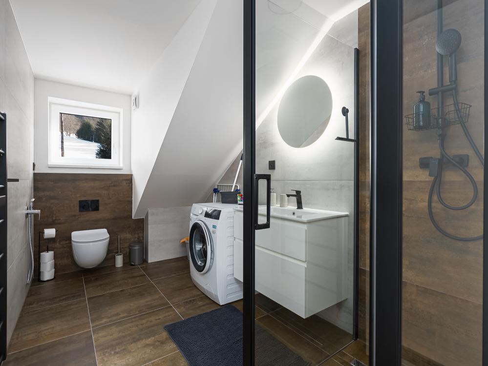 ✔ Z hlavní místnosti vedou schody do patra, kde se nachází další druhá koupelna se sprchou, WC, umyvadlem a pračkou.