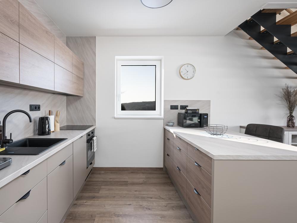 ✔ Velká hlavní místnost nabízí pohodlné místo pro odpočinek a společné chvíle. V této místnosti se nachází plně vybavená kuchyň, ideální pro přípravu jídel a rodinné večeře.
